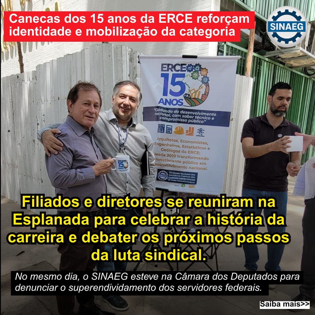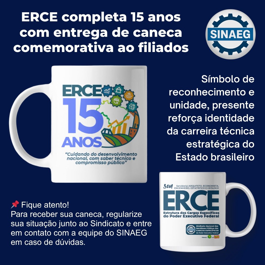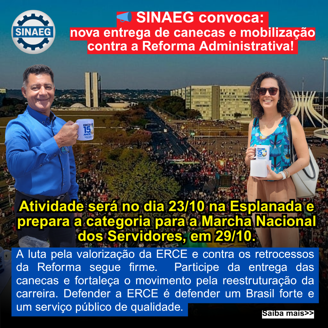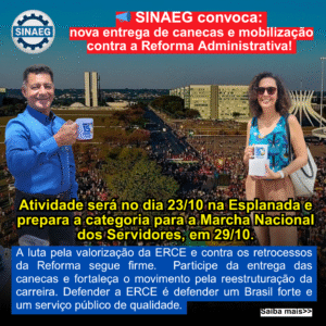 O SINAEG realizará na quarta-feira, 23 de outubro, uma nova edição da entrega presencial das canecas comemorativas dos 15 anos da ERCE, na calçada do Bloco B da Esplanada dos Ministérios, em Brasília, das 11h30 às 14h. O evento é mais uma oportunidade para os filiados retirarem o brinde, reencontrarem colegas e dialogarem com a… SINAEG realiza nova entrega de canecas da ERCE e convoca para marcha dos servidores contra a Reforma Administrativa