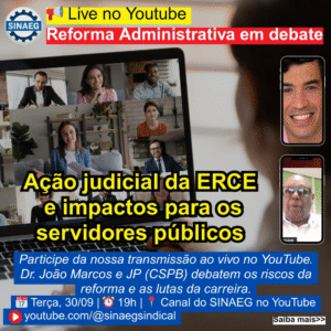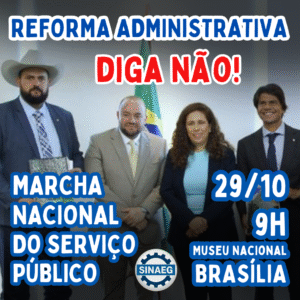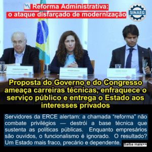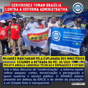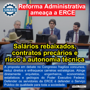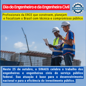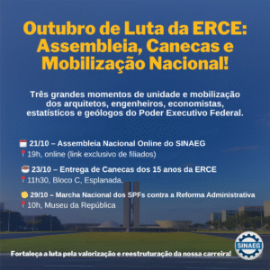 O Sinaeg convoca todos os colegas servidores da Estrutura dos Cargos Específicos (Erce) — arquitetos, engenheiros, economistas, estatísticos e geólogos — para três grandes momentos de mobilização e unidade em defesa da carreira e do serviço público neste mês de outubro: Pelo fortalecimento do serviço público e contra os ataques às carreiras técnicas! ERCE –… OUTUBRO DE LUTA DA ERCE: Assembleia (21), Canecas (23) e Marcha Nacional (29)!