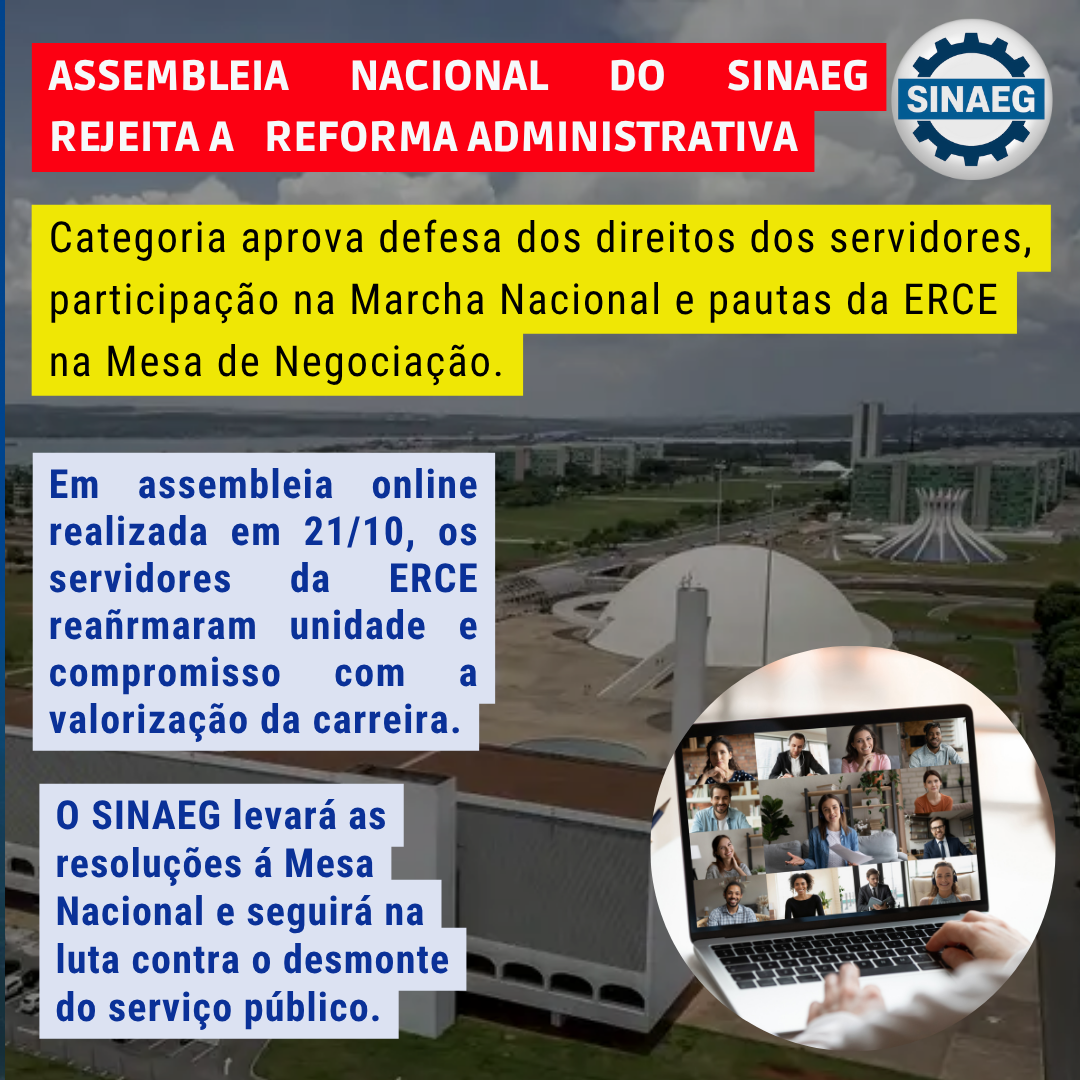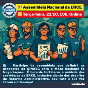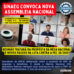 Reunião virtual será na terça-feira (4/11), às 19h, e tratará da proposta apresentada na Mesa Nacional e da resistência à PEC 38/2025 O SINAEG convoca os/as filiados/as da Estrutura dos Cargos Específicos (ERCE) — arquitetos, engenheiros, economistas, estatísticos e geólogos — para participarem da Assembleia Nacional Extraordinária, que será realizada na terça-feira, 4 de novembro,… SINAEG convoca nova assembleia nacional para avaliar proposta do Governo e definir novos passos da luta