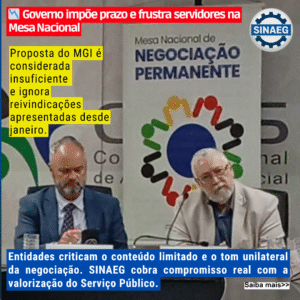 A reunião da Mesa Nacional de Negociações Permanentes do Serviço Público (MNNPSP), realizada na quarta-feira (22/10), escancarou o impasse entre o governo federal e as entidades sindicais. O Ministério da Gestão e da Inovação em Serviços Públicos (MGI) anunciou que os servidores têm até o dia 6 de novembro para aceitar ou rejeitar o que… Em nova rodada da Mesa Nacional de Negociações, MGI frustra servidores e ainda impõe prazo