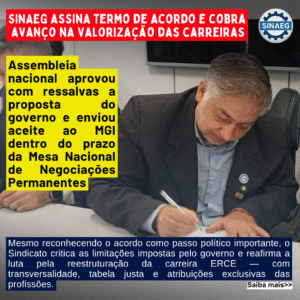 Após aprovação em assembleia nacional extraordinária, realizada no dia 4 de novembro, o SINAEG comunicou oficialmente ao Ministério da Gestão e da Inovação em Serviços Públicos (MGI) o aceite, com ressalvas, à proposta de reajuste dos benefícios apresentada na 12ª reunião da Mesa Nacional de Negociações Permanentes (MNNP). O termo de compromisso foi assinado nesta… SINAEG assina acordo no MGI e reforça luta pela reestruturação da carreira