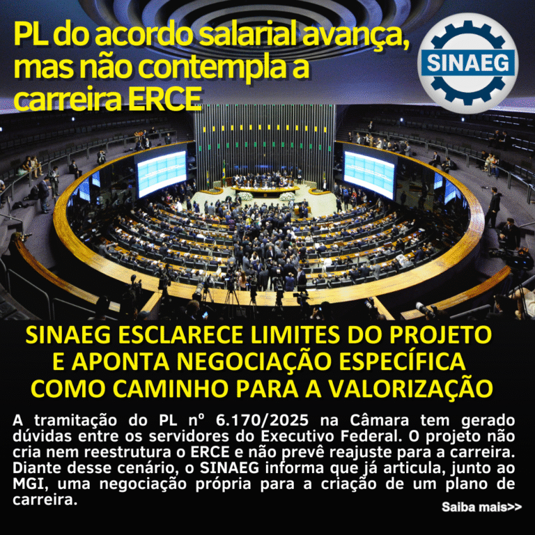 Com o avanço da tramitação do PL nº 6.170/2025 e de projetos apensados na Câmara dos Deputados, surgem dúvidas entre os servidores sobre os impactos dessas propostas nas carreiras do Executivo Federal. O SINAEG considera essencial esclarecer, de forma objetiva, o alcance real desses projetos e os caminhos para a valorização do ERCE. O PL… PL nº 6.170/2025: SINAEG esclarece e aponta na negociação específica o caminho para a valorização da ERCE