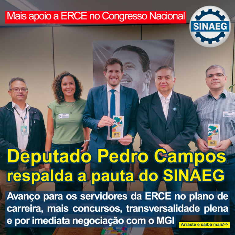 O SINAEG reuniu-se em 17 de março com o deputado federal Pedro Campos (PSB/PE), em mais um avanço na agenda institucional da ERCE. O encontro consolidou a apresentação da pauta e abriu diálogo com a base governista sobre a consolidação da carreira da ERCE. Pelo sindicato, participaram Flauzino Antunes Neto, presidente; Roberto Carvalho, secretário-geral; Lorena… Deputado Pedro Campos apoia a pauta do SINAEG