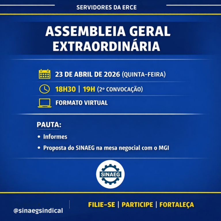 O SINAEG convoca seus filiados e filiadas a participarem da assembleia de fundação da Associação Nacional dos Servidores da Estrutura Remuneratória dos Cargos Específicos (ANERCE), que será realizada no dia 31 de março de 2026, em formato virtual, por meio da plataforma Google Meet. A assembleia ocorrerá às 19h, em primeira chamada, e às 19h30,… Anote na Agenda: 31 de março! SINAEG convoca filiados para assembleia de fundação da ANERCE