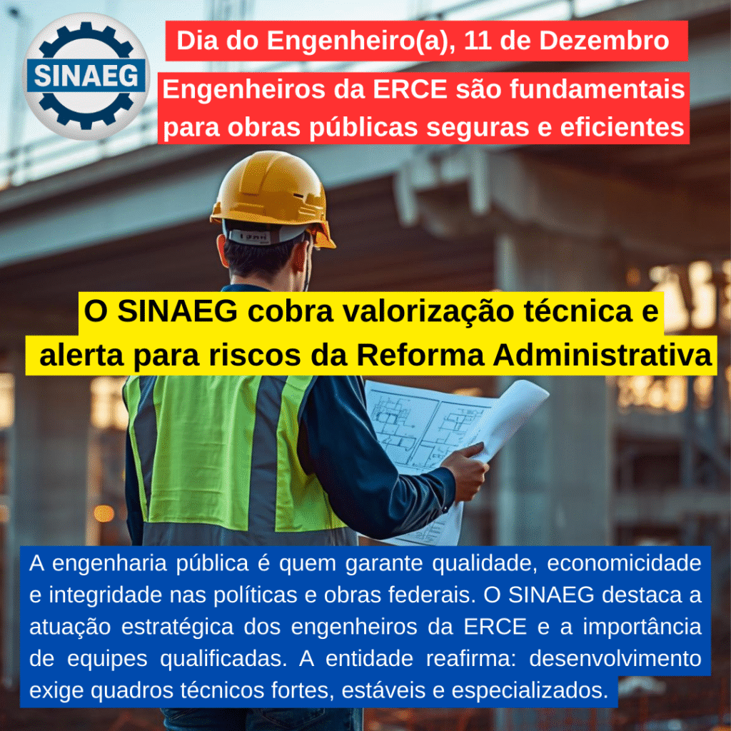 O SINAEG reafirma: valorizar engenheiros e demais cargos da ERCE é investir na segurança das obras, no uso correto dos recursos públicos e no futuro do país. Hoje, celebramos os profissionais que constroem o Brasil — e renovamos a luta por um serviço público forte, técnico e comprometido com o desenvolvimento.