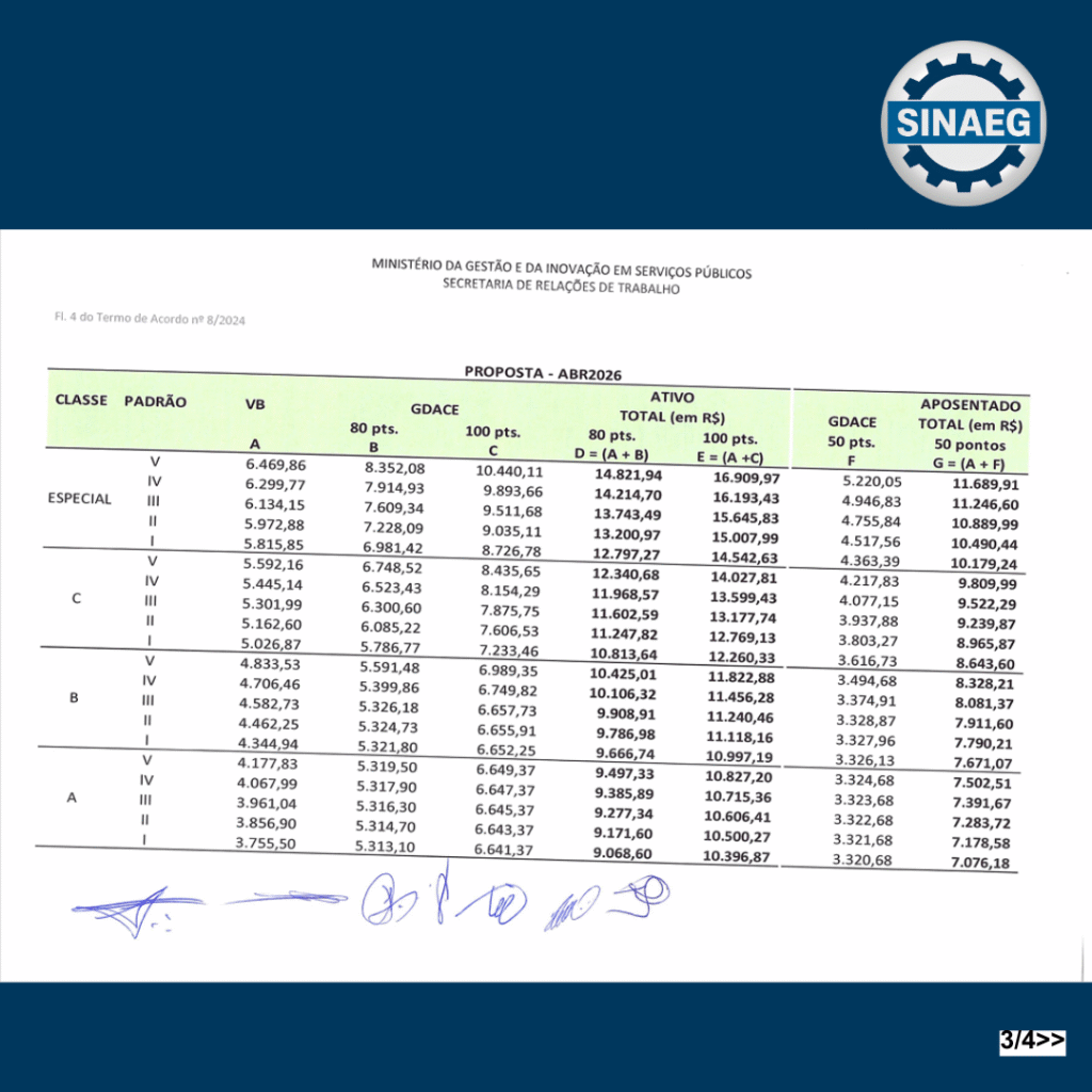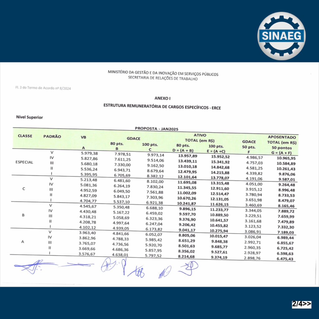 É fundamental afirmar com clareza: não houve reestruturação da carreira. No entanto, houve vitória. Esse resultado é fruto da luta, da mobilização e da organização do SINAEG e da categoria. Conseguimos elevar o percentual inicialmente oferecido pelo governo e garantir um reajuste mínimo para todos os níveis da carreira.