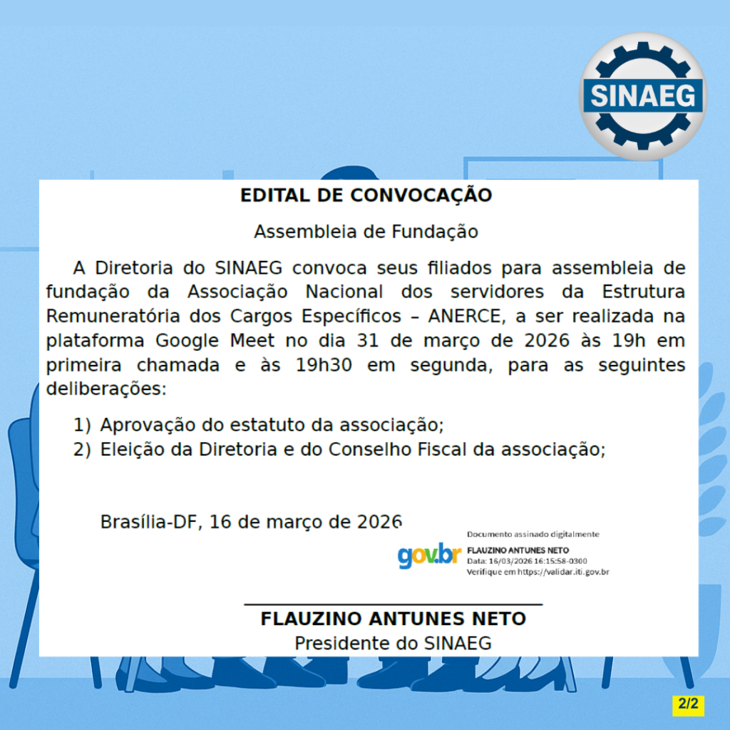 O SINAEG convoca seus filiados e filiadas a participarem da assembleia de fundação da Associação Nacional dos Servidores da Estrutura Remuneratória dos Cargos Específicos (ANERCE), que será realizada no dia 31 de março de 2026, em formato virtual, por meio da plataforma Google Meet.