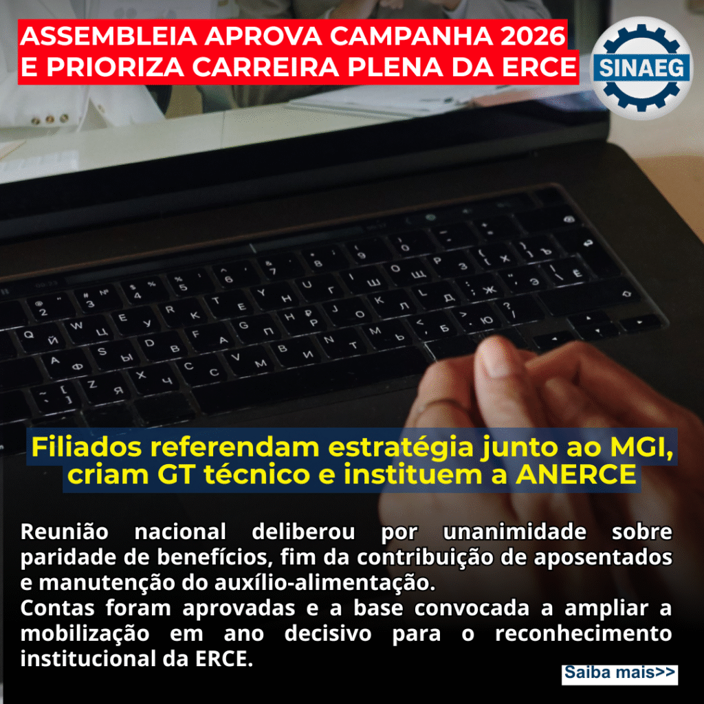 A Assembleia também aprovou a criação da ANERCE, associação nacional “espelho” do SINAEG, destinada à representação cível e ao ajuizamento de ações coletivas, inclusive de equiparações remuneratórias, sem custos adicionais aos filiados.