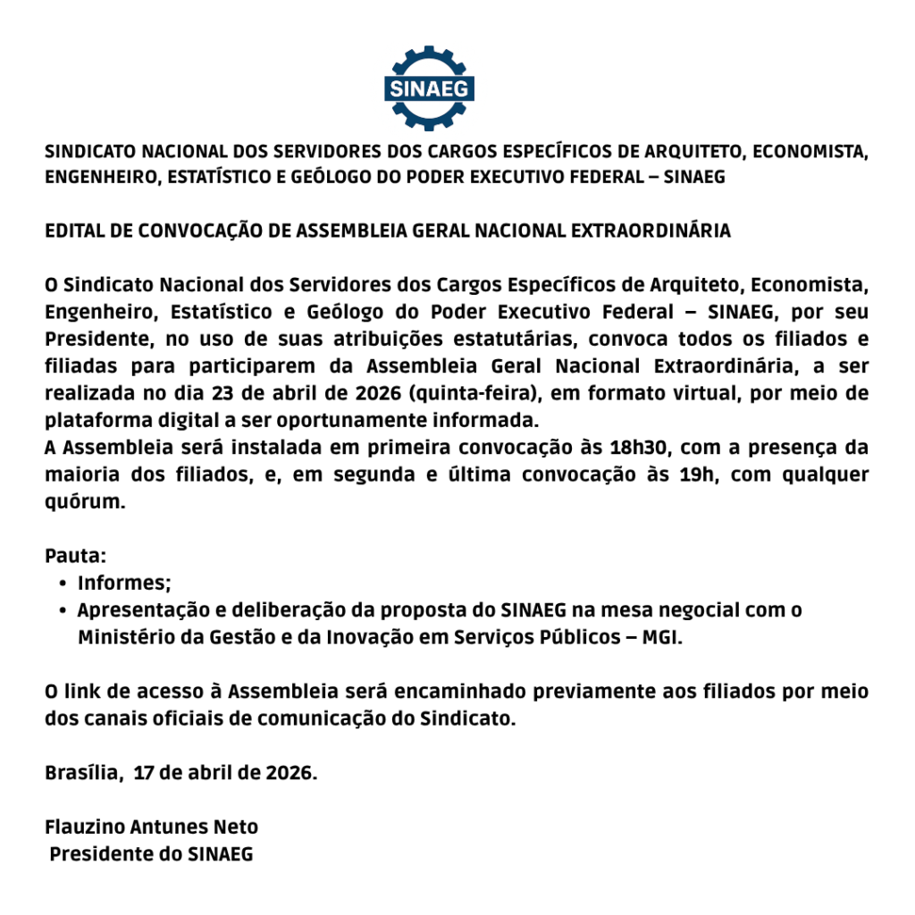 O Sindicato Nacional dos Servidores dos Cargos Específicos de Arquiteto, Economista, Engenheiro, Estatístico e Geólogo do Poder Executivo Federal – SINAEG, por seu Presidente, no uso de suas atribuições estatutárias, convoca todos os filiados e filiadas para participarem da Assembleia Geral Nacional Extraordinária, a ser realizada no dia 23 de abril de 2026 (quinta-feira), em formato virtual, por meio de plataforma digital a ser oportunamente informada.
