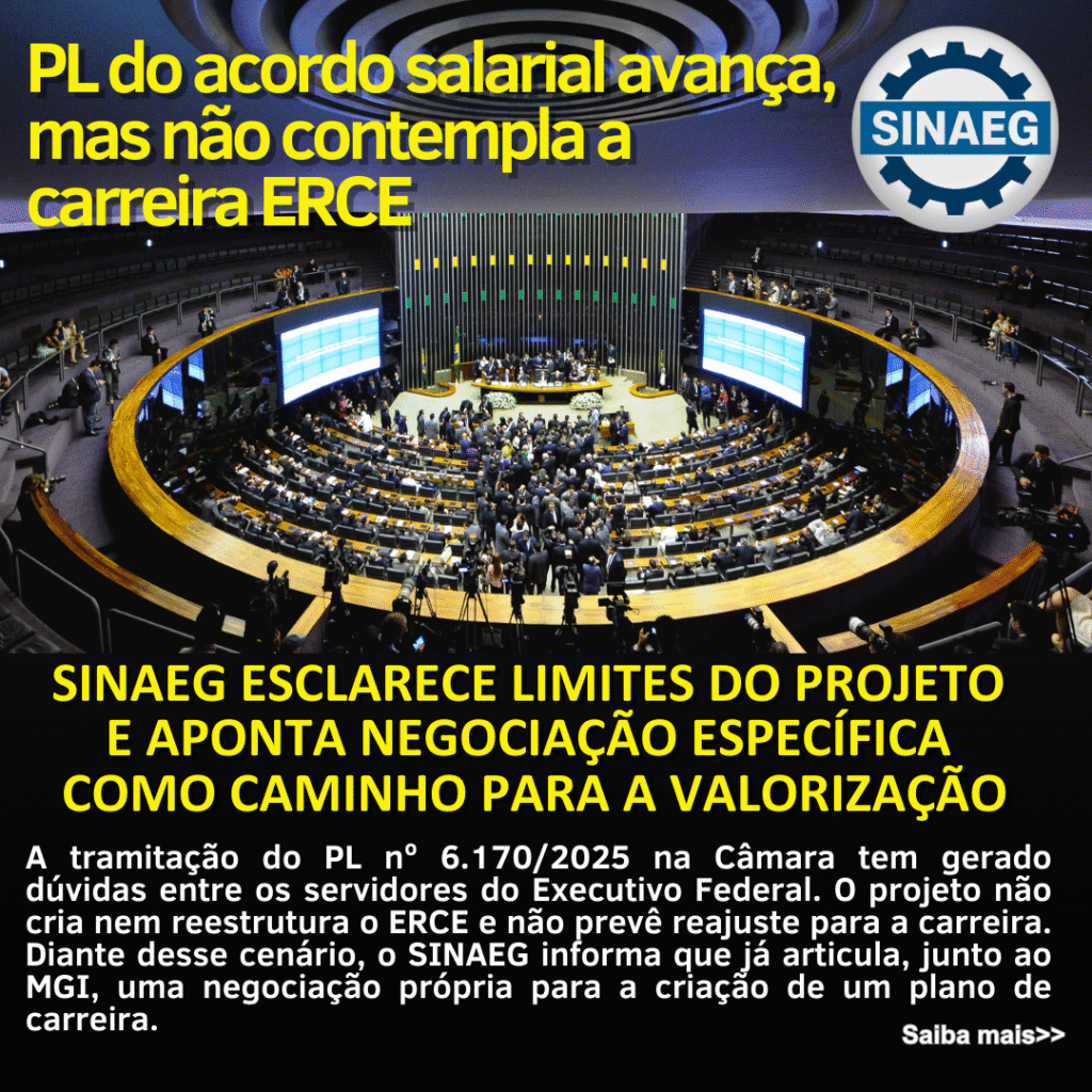 Nesse contexto, o SINAEG informa que já está em tratativas com o MGI para a construção de uma negociação específica voltada à criação de um plano de carreira para o ERCE, como desdobramento da reunião realizada em 02 de dezembro. O processo está em fase inicial, mas representa um passo concreto.