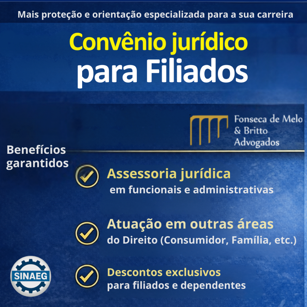 O SINAEG firmou convênio com o escritório Fonseca de Melo & Britto Advogados, com o objetivo de ampliar o acesso dos filiados à orientação e assessoria jurídica especializada, em condições diferenciadas. A iniciativa integra o conjunto de ações do sindicato voltadas à valorização da filiação e ao fortalecimento da proteção individual dos servidores representados.