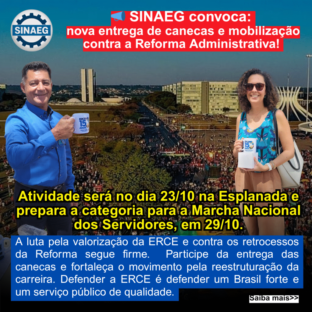 O SINAEG reforça o chamado à categoria para participar da Marcha Nacional dos Servidores Públicos Federais, marcada para o dia 29 de outubro, em Brasília. O ato, que reunirá entidades de todo o país, busca pressionar o Congresso pela rejeição da proposta e reafirmar o compromisso com um Estado forte, democrático e comprometido com o bem público.