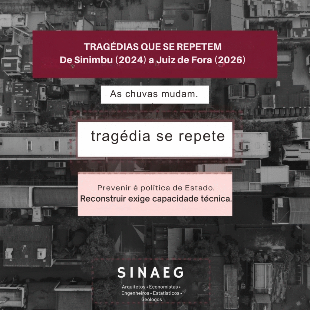 Na carta de 2024, redigida no contexto das enchentes no Rio Grande do Sul, o SINAEG alertava que a repetição de tragédias climáticas estava diretamente associada à insuficiência de planejamento estrutural, à fragilidade da infraestrutura urbana e à carência de quadros técnicos valorizados no Estado.